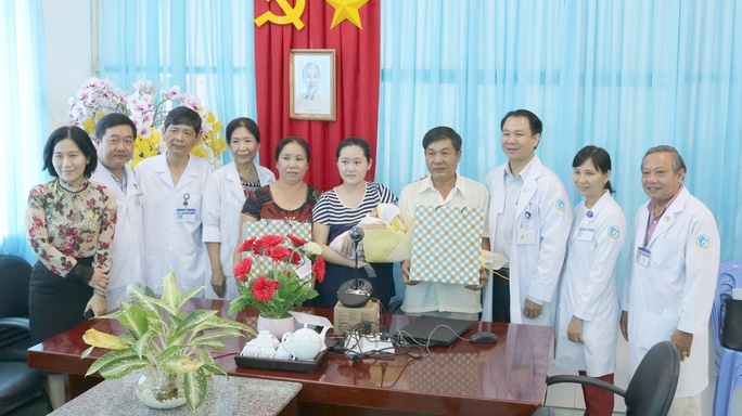TS-BS Trần Quang Hiền (thứ 3 từ phải sang) cùng chia sẻ niềm vui với gia đình có trẻ sơ sinh được điều trị lành bệnh.