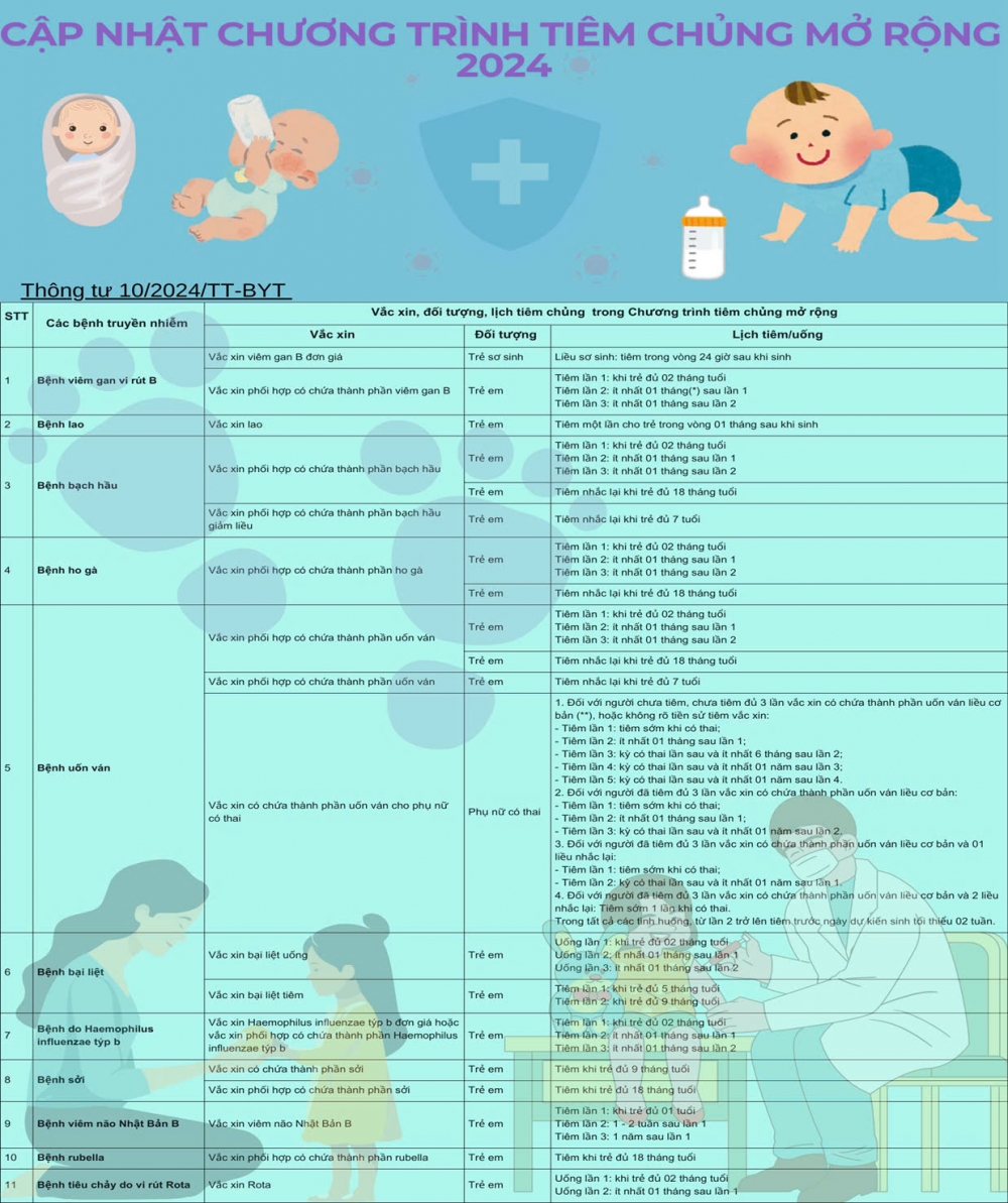 Vắc xin phòng các bệnh truyền nhiễm nguy hiểm được triển khai trong Chương trình tiêm chủng mở rộng 2024: Lao, Viêm gan siêu vi B, Bạch hầu, Ho gà, Uốn ván, HiB, Bại liệt, Sởi, Rubella, Rota, Viêm não Nhật Bản B.