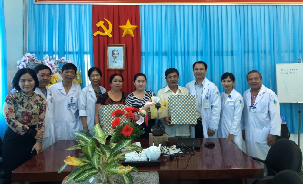 Bs. Hiền trao quà cho thân nhân gia đình bé thoát vị hoành