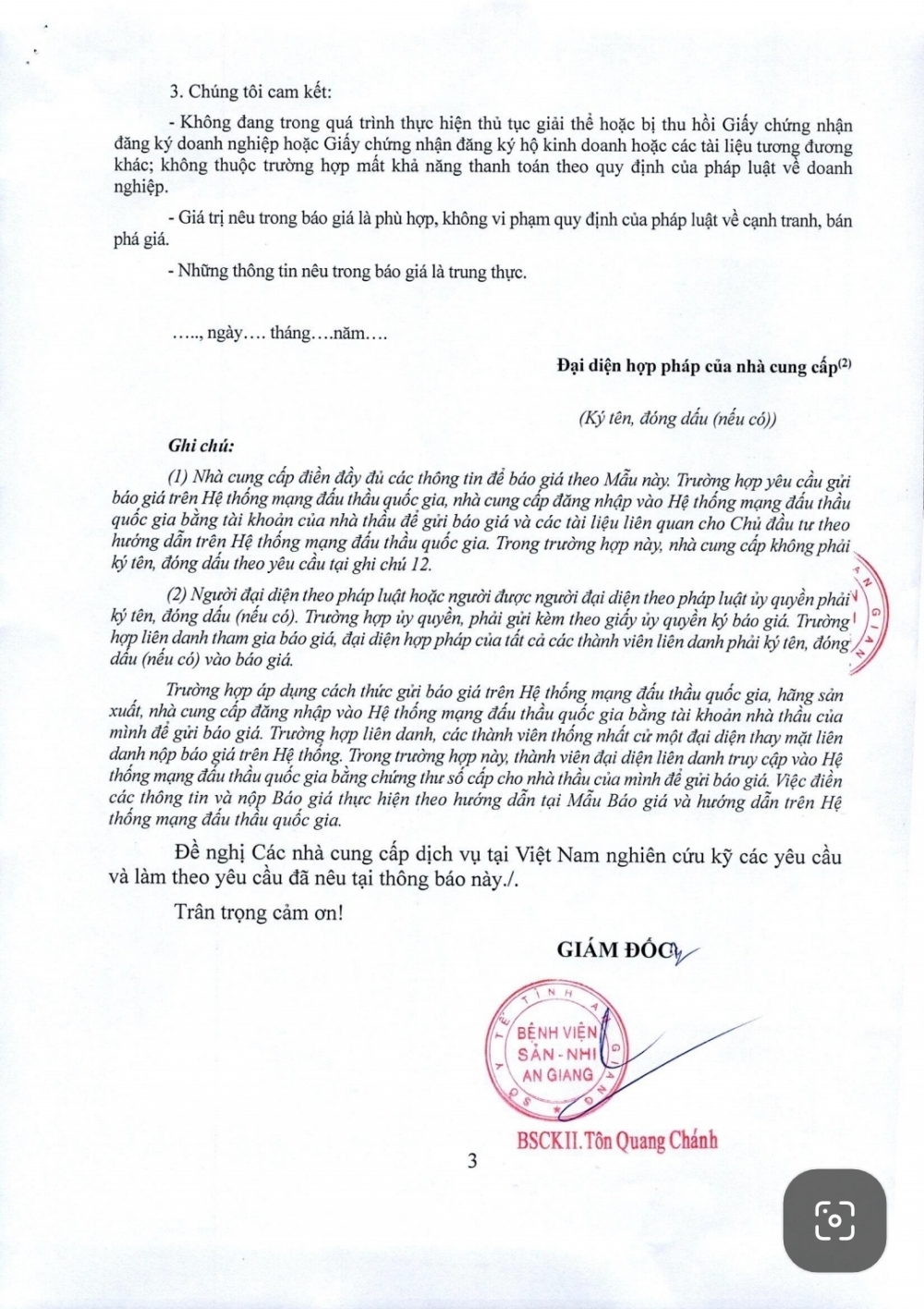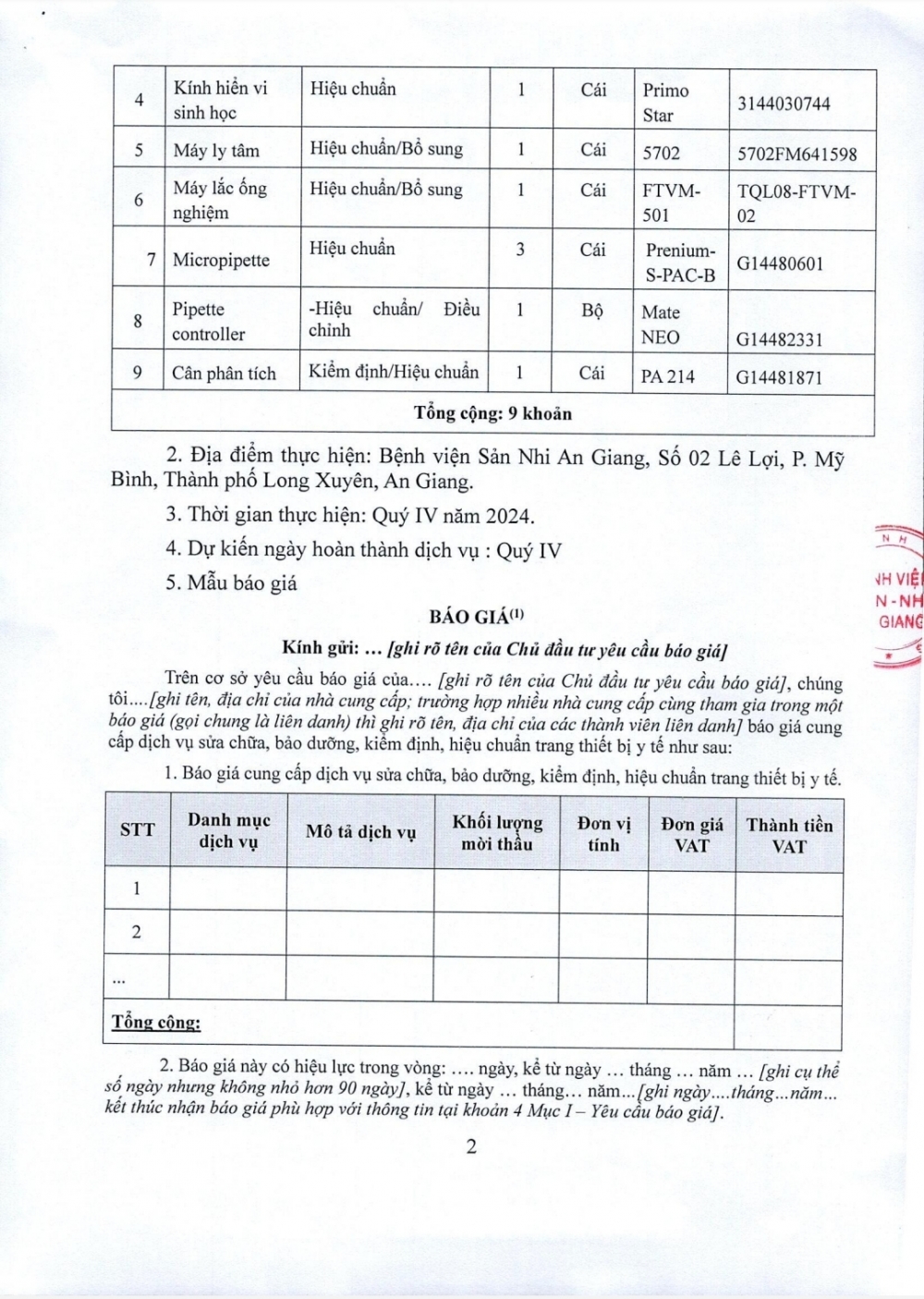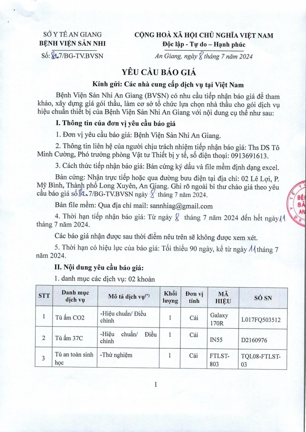Yêu Cầu Báo Giá Gói Thầu Hiệu Chuẩn Thiết Bị Của Bệnh Viện Sản Nhi An Giang 10/02/2025 45 Mời Thầu - Chào giá Share Yêu Cầu Báo Giá Gói Thầu Hiệu Chuẩn Thiết Bị Của Bệnh Viện Sản Nhi An Giang TAGS: thông báo bệnh viện thong bao benh vien Yêu Cầu Báo Giá Gói Thầu Hiệu Chuẩn Thiết Bị Của Bệnh Viện Sản Nhi An Giang yeu cau bao gia goi thau hieu chuan thiet bi cua benh vien san nhi an giang
