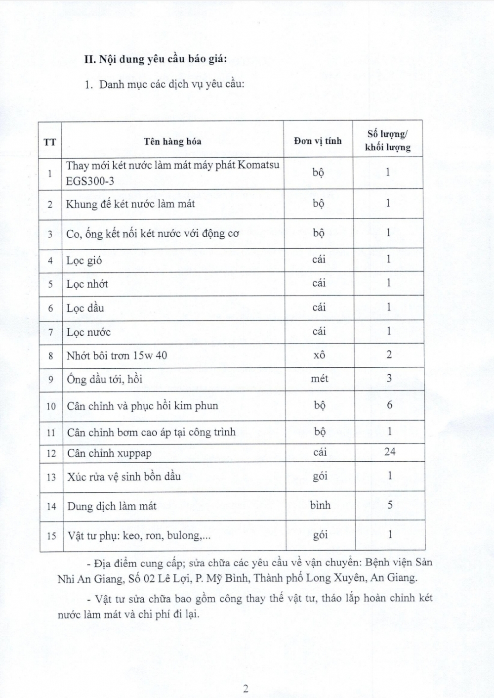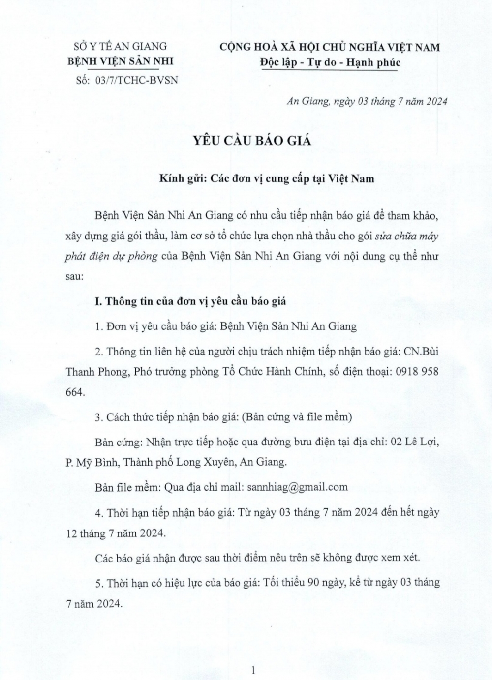 Yêu Cầu Báo Giá Gói Thầu Sửa Chữa Máy Phát Điện Dự Phòng Của Bệnh Viện Sản Nhi An Giang
