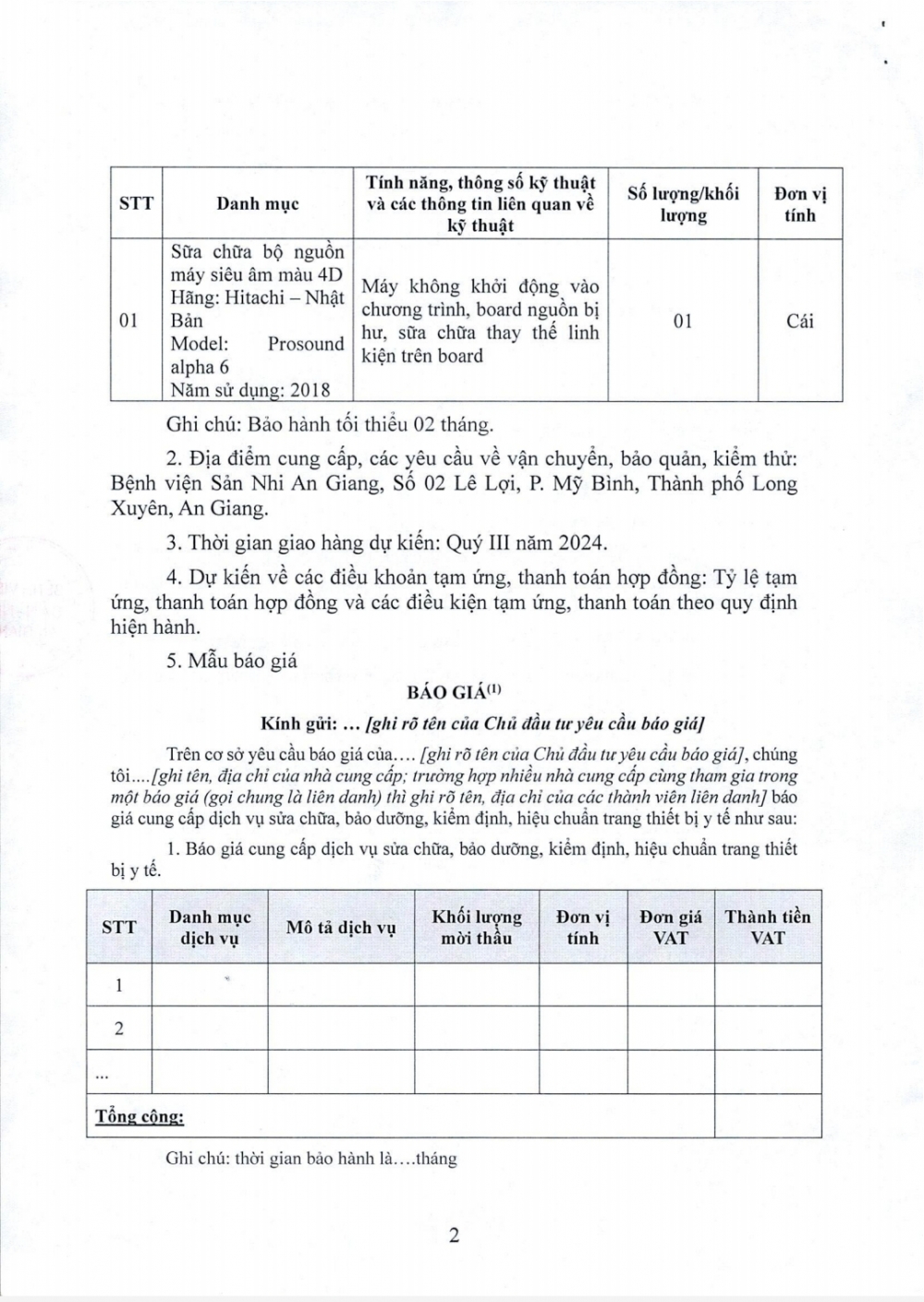 Yêu Cầu Báo Giá Gói Thầu Sửa Chữa Máy Siêu Âm Màu 4d Của Bệnh Viện Sản Nhi An Giang