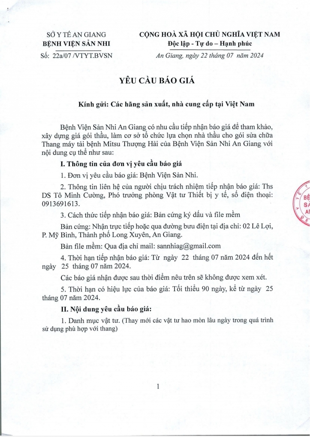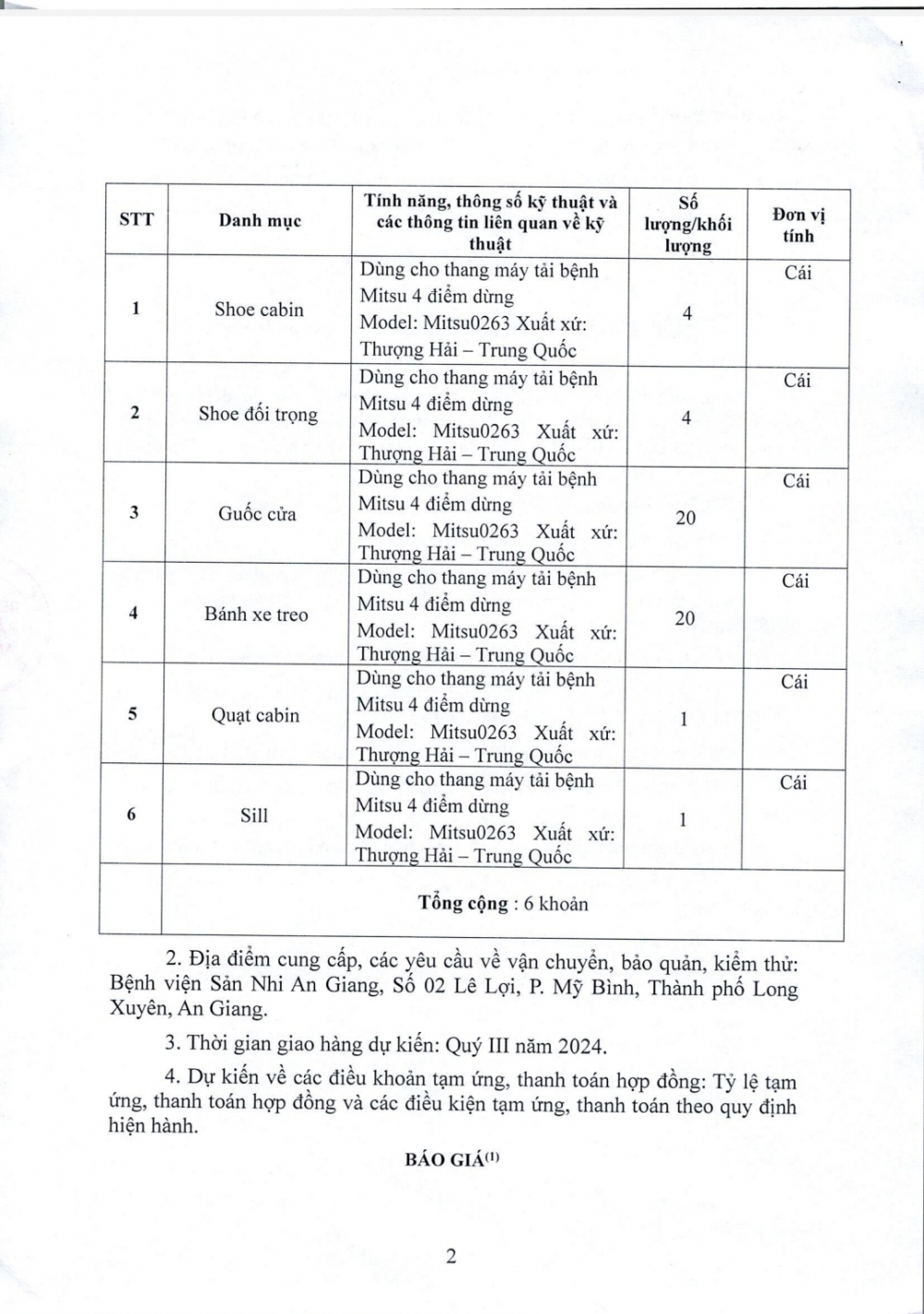 Yêu Cầu Báo Giá Gói Thầu Sửa Chữa Thang Máy Tải Mitsu Thượng Hải Của Bệnh Viện Sản Nhi An Giang